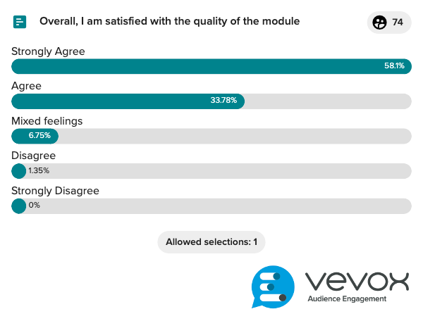 In Autumn semesters, I teach CSC1058: User Interface Design and Implementation (former CA357), to Computer Science and Computing for Business students, here in the School of Computing, Dublin City University. Following are some of the results from module exit survey in 2021, administered in the last 2 weeks of the semester (74 students responded out of 173).